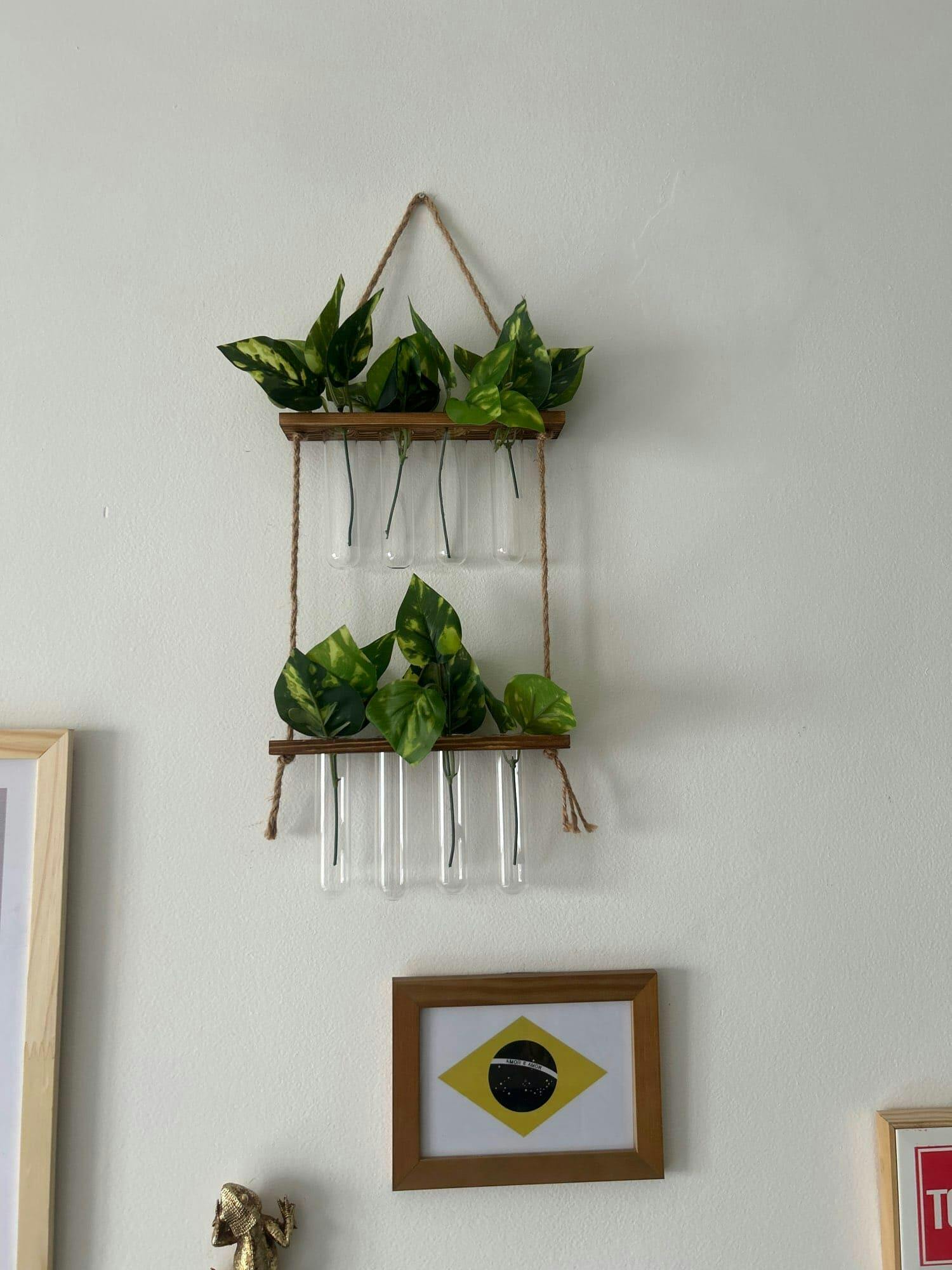 Introduisez une véritable œuvre d'art dans votre intérieur avec le Soliflore Suspendu. Doté de 8 tubes à essai en verre délicat, habilement soutenus par un support en bois élégant, ce soliflore offre une présentation florale aérienne et captivante. D'une taille totale de 50x22cm, il se distingue visuellement, créant un impact instantané dans n'importe quelle pièce.