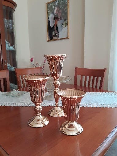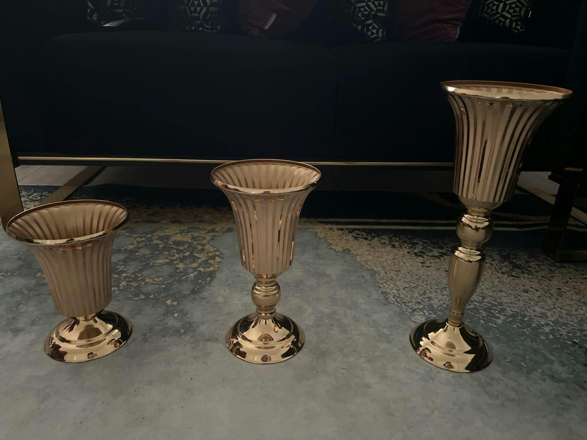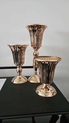Sublimez votre mariage avec nos 3 vases décoratifs en métal. Luxueux en argent ou en or rose, ils ajoutent une touche sophistiquée à vos tables de réception.